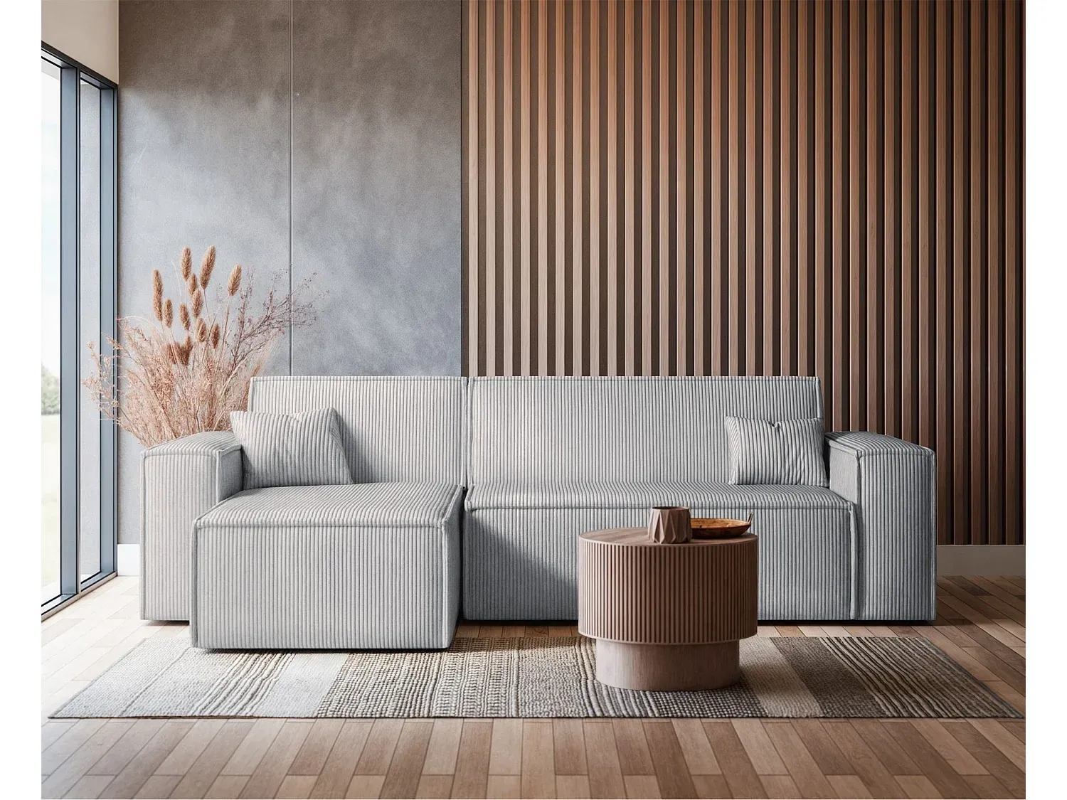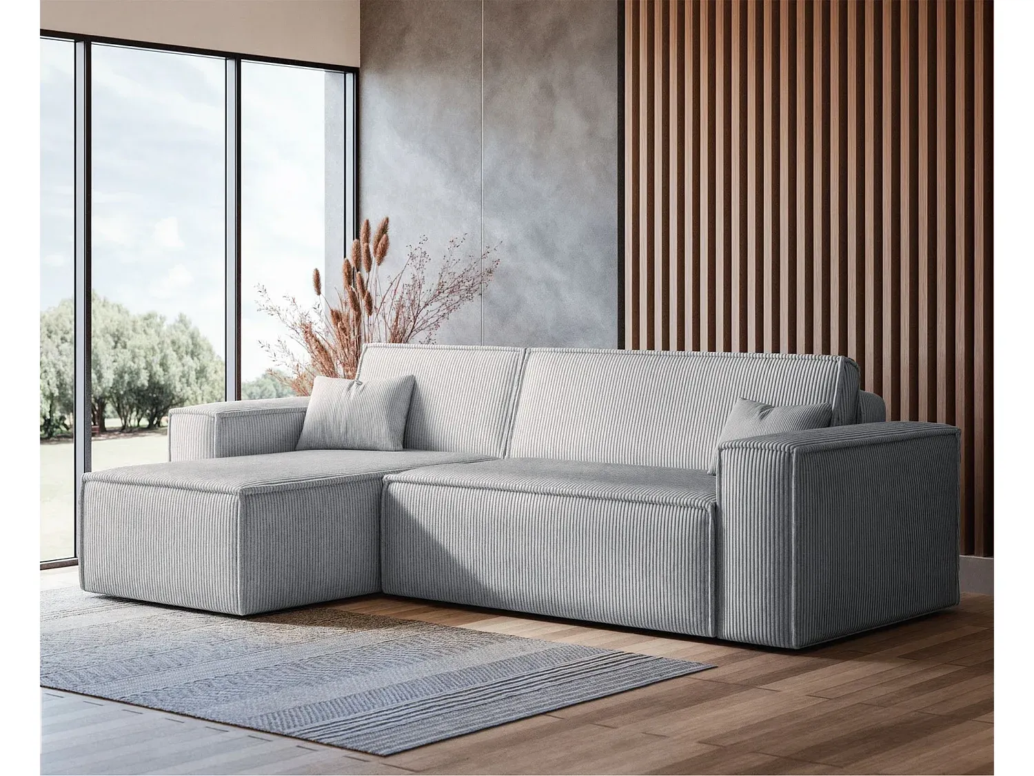 Ecksofa mit Schlaffunktion und Cordbezug in Hellgrau