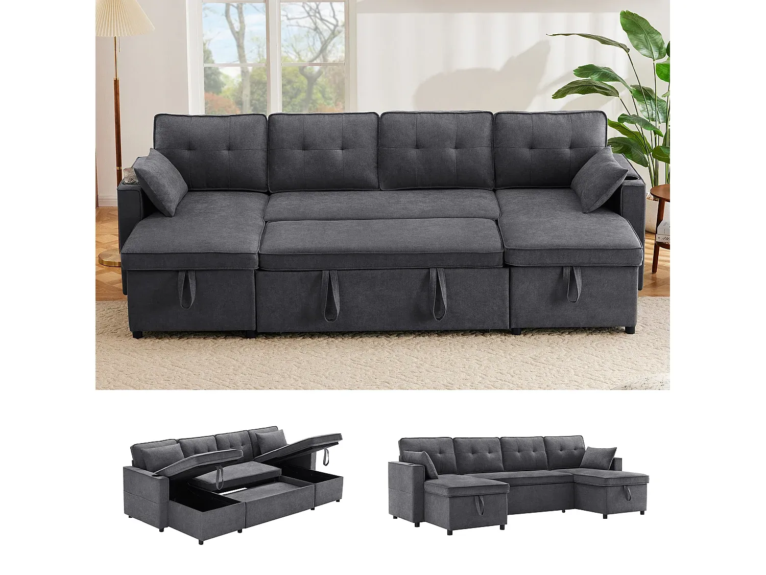 Modernes U-förmiges Schlafsofa für vier Personen mit Stauraum und Getränkehalter, Grau